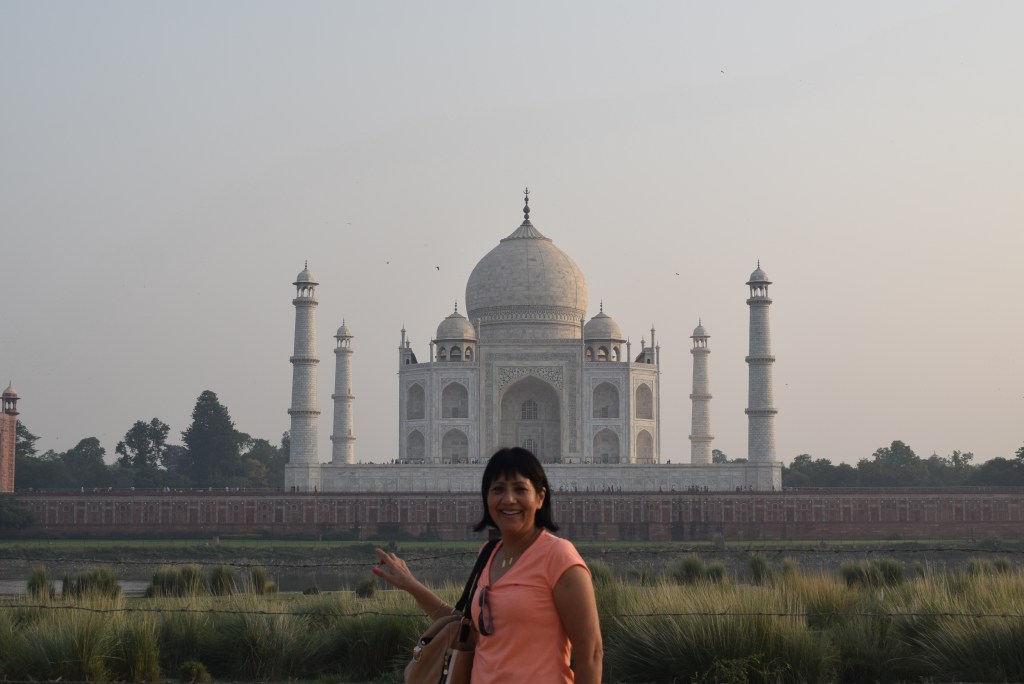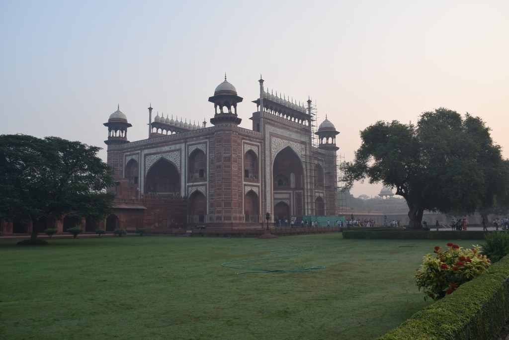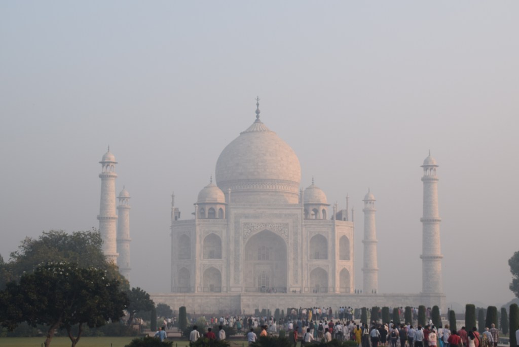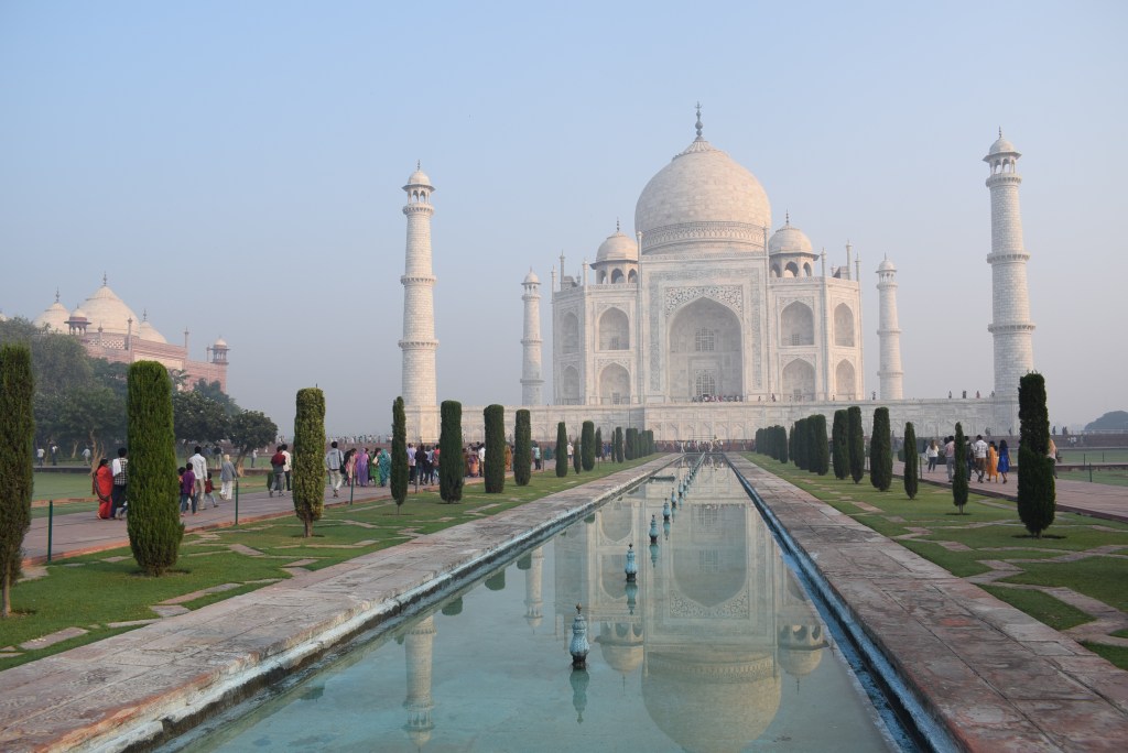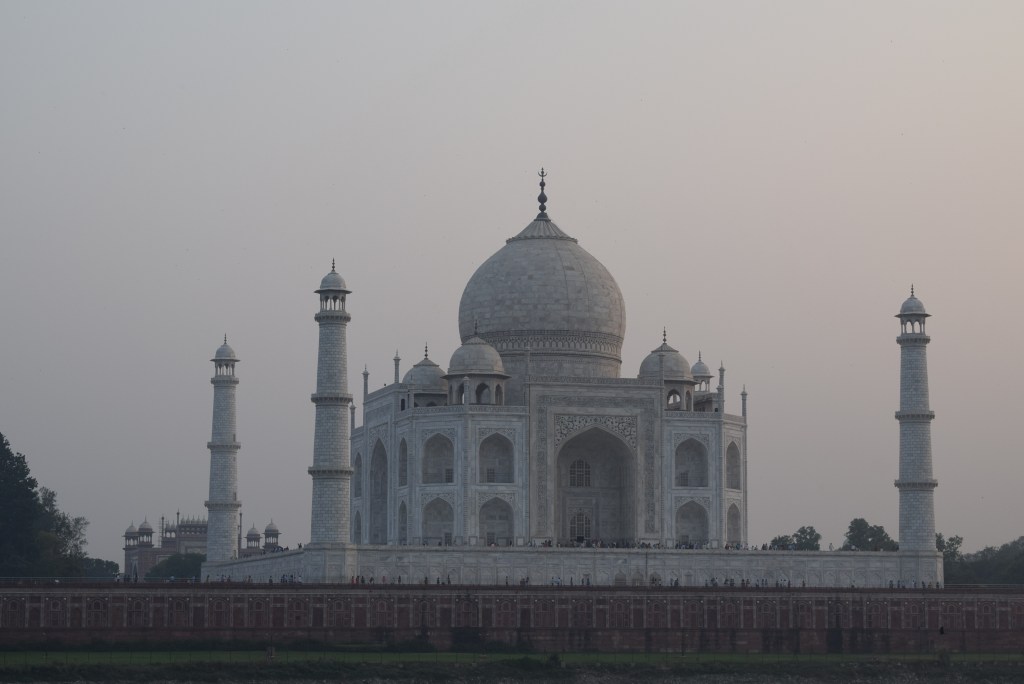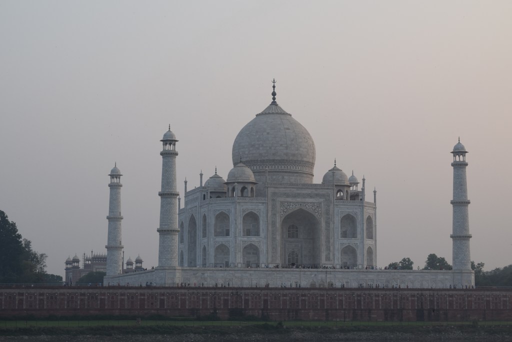 El Taj Mahal (hindi: ताज महल Tāj Mahal, urdu: تاج محل Tāŷ Mahal ‘Corona de los palacios’; /tɑːʒ mə’hɑl/)12 es un monumento funerario construido entre 1631 y 1654 en la ciudad de Agra, estado de Uttar Pradesh (India), a orillas del río Yamuna, por el emperador musulmán Shah Jahan de la dinastía mogol. El imponente conjunto de edificios se erigió en honor de su esposa favorita, Arjumand Banu Begum —más conocida como Mumtaz Mahal— que murió en el parto de su decimocuarto hijo. Se estima que en su construcción trabajaron unos 20 000 obreros bajo dirección de un conjunto de arquitectos liderados por el arquitecto de la corte, Ustad Ahmad Lahori.34